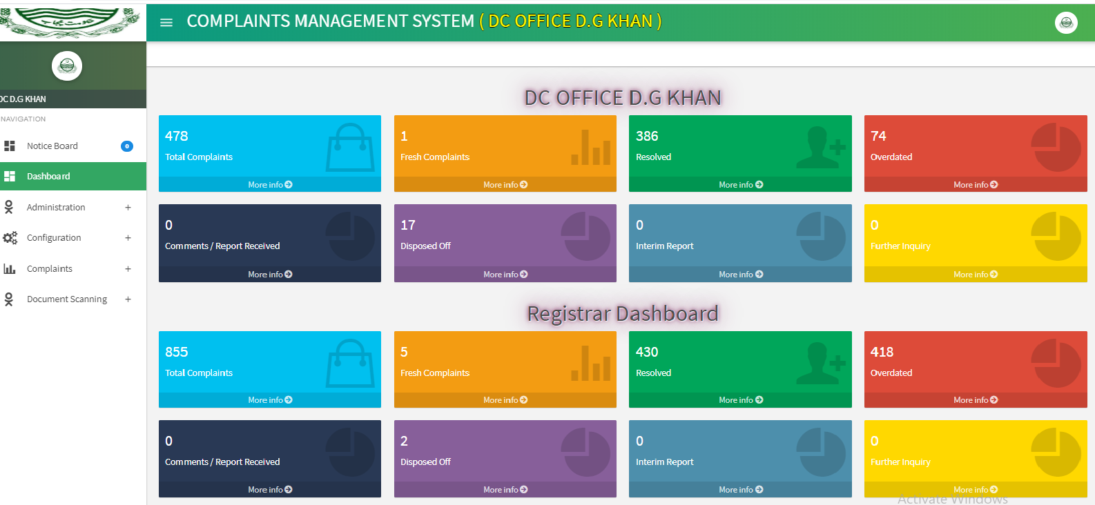 Office of Deputy Commissioner is an open office for all residents. Any person can visit and meet Deputy Commissioner during office hours for the redressal of his grievance. Official number of Deputy Commissioner has been displayed at all important branches of DC office, Arazi Record Centers and all health facilities. People can directly call Deputy Commissioner for the resolution of their grievance issues.